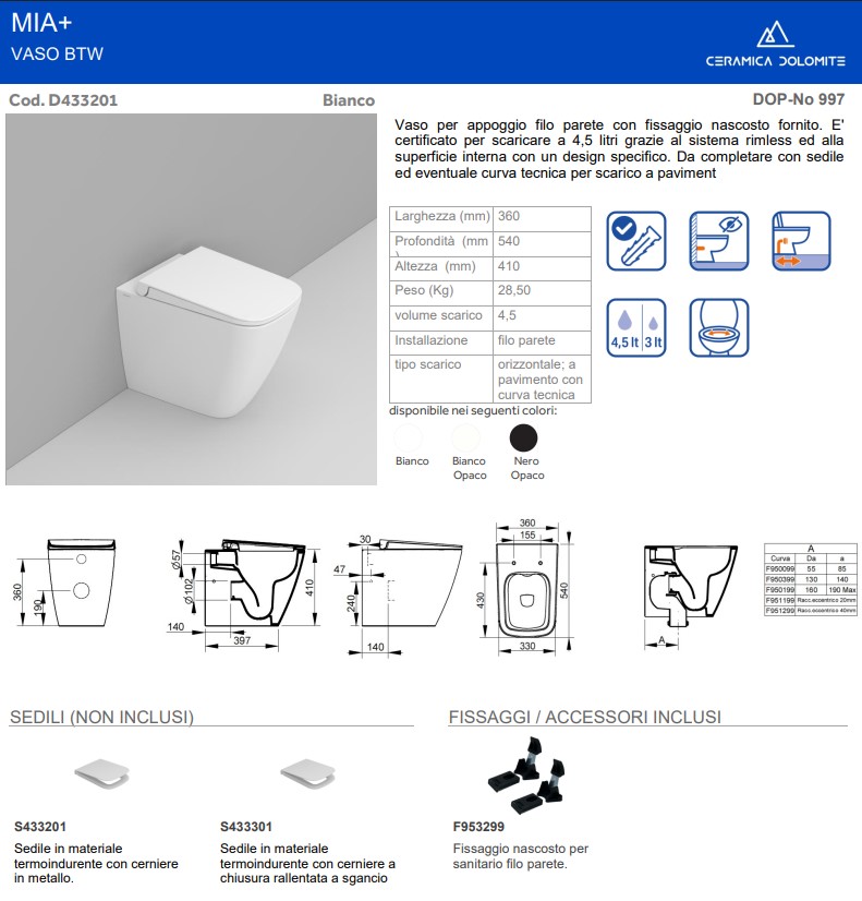 Dotato di fissaggi nascosti inclusi, coniuga pulizia visiva e installazione discreta. Il design “back-to-wall” garantisce un’estetica minimalista, mentre il sistema rimless, insieme alla superficie interna ottimizzata, assicura un risciacquo efficiente da 4,5 litri e una manutenzione semplice.