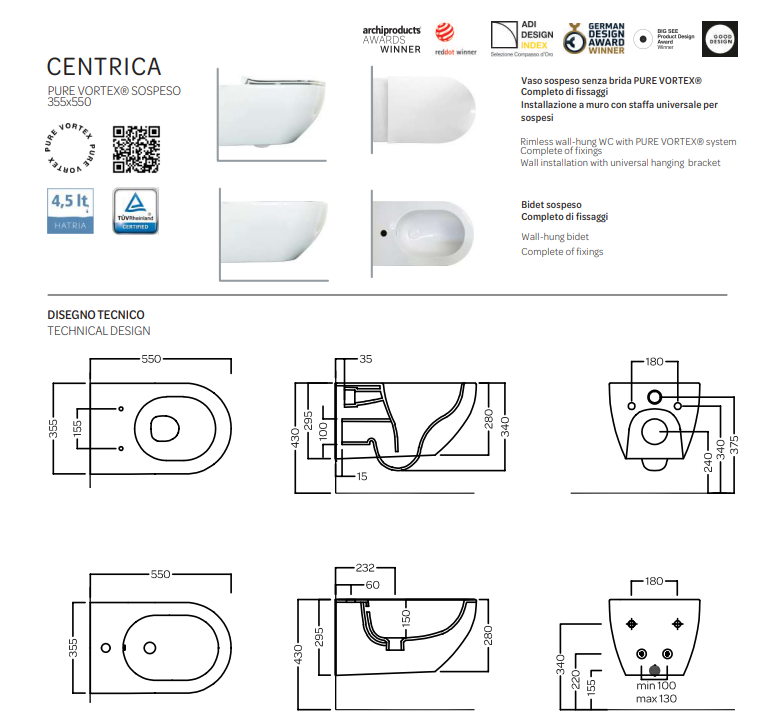 Centrica di Hatria rappresenta il massimo della versatilità, grazie a una proposta ricca e articolata. Alla versione a pavimento con scarico traslato – compatibile anche con impianti già esistenti – si affianca il modello sospeso. L’altezza aumentata di vaso e bidet a terra (43 cm) assicura una fruizione comoda e accessibile, rendendo l’utilizzo quotidiano ancora più confortevole. Il tutto è arricchito dall’esclusivo sistema di scarico PURE VORTEX®, più volte premiato, che offre un’esperienza di benessere impareggiabile.