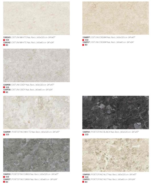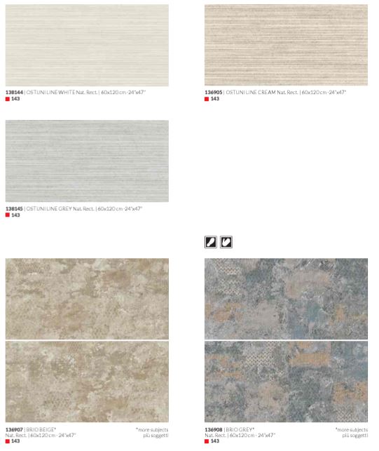 Decoro Brio beige, Decoro Brio grey, Decoro Ostuni Line cream, Decoro Ostuni Line grey, Decoro Ostuni Line white, Ostuni cream, Ostuni grey, Ostuni white, Portofino black, Portofino dark, Portofino nut, Portofino white